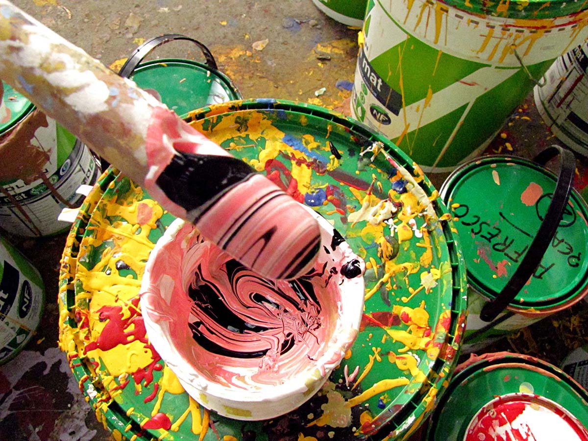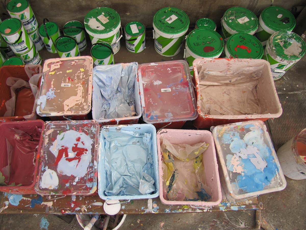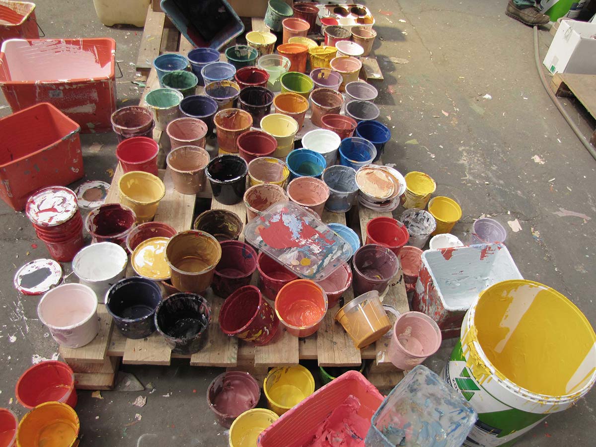 Des tonnes de peinture acrylique, en fûts, en gros pots, en petits, à mélanger selon appétit !