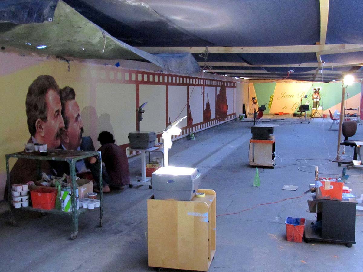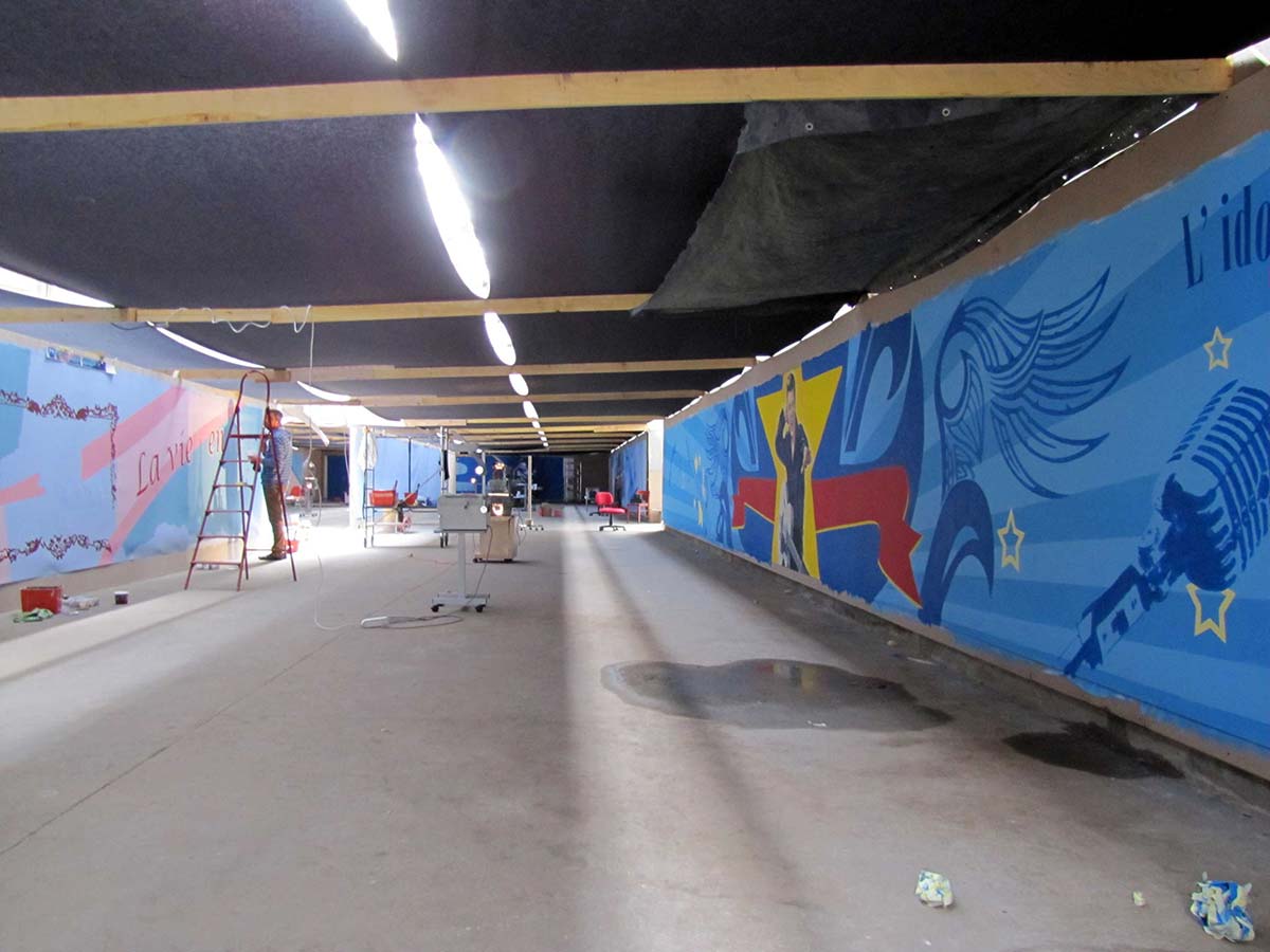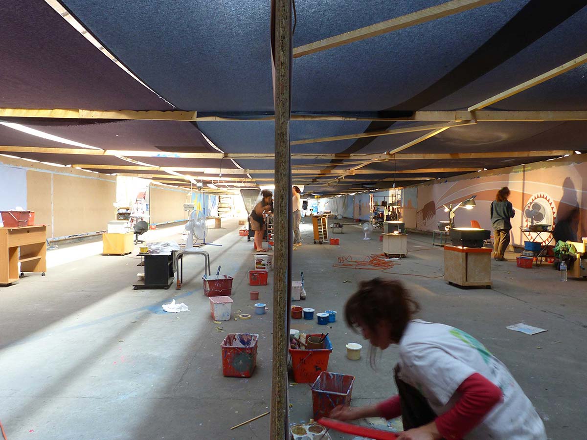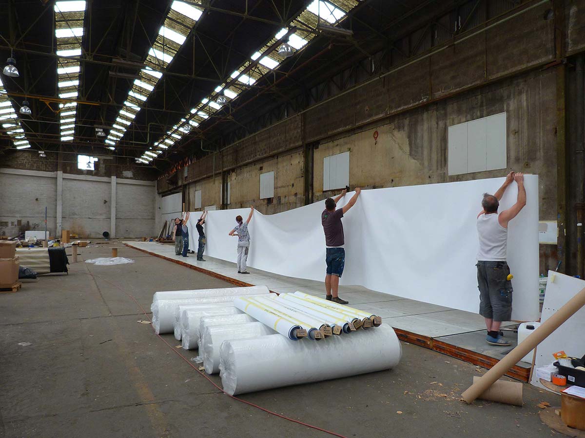 Un atelier de 2000 m², 200 mètres linéaires de panneaux bois installés, 5 kilomètres de toile spécialement fabriquée en Tchéquie, découpée sur une piste de 40 mètres de long... un projet hors normes !