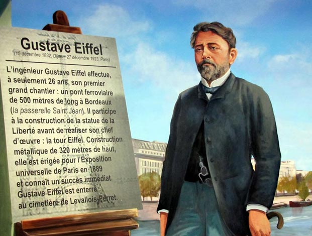L’ingénieur Gustave Eiffel effectue, à seulement 26 ans, son premier grand chantier : un pont ferroviaire de 500 mètres de long à Bordeaux. Auteur de nombreux viaducs et gares, il participe à la construction de la statue de la Liberté avant de réaliser son chef d’œuvre : la tour Eiffel. Construction métallique de 320 mètres de haut, elle est érigée pour l’Exposition universelle de Paris en 1889 et connaît un succès immédiat. Contribuant à l’essor de l’aviation en créant le premier laboratoire d’aérodynamique en 1912, Gustave Eiffel est enterré au cimetière de Levallois-Perret.