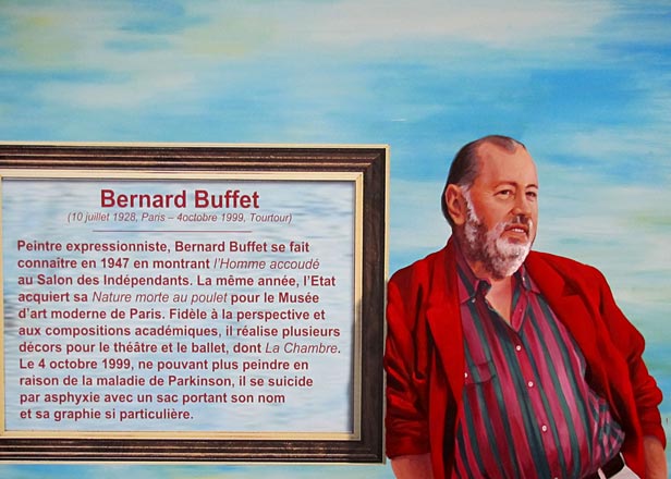 Peintre expressionniste, Bernard Buffet se fait connaître en 1947 en montrant l’Homme accoudé au Salon des Indépendants. La même année, l’Etat acquiert sa Nature morte au poulet pour le Musée d’art moderne de Paris. Fidèle à la perspective et aux compositions académiques, il réalise plusieurs décors pour le théâtre et le ballet, dont La Chambre. Le 4 octobre 1999, ne pouvant plus peindre en raison de la maladie de Parkinson, il se suicide par asphyxie avec un sac portant son nom et sa graphie si particulière.