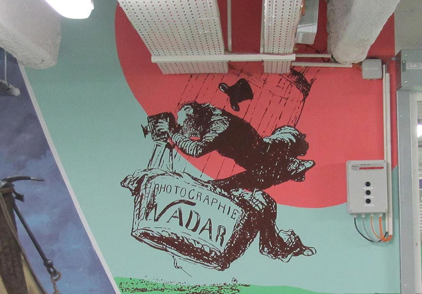 Félix Tournachon, dit Nadar, débute comme journaliste et caricaturiste puis se tourne vers la photographie. Dans son atelier en lumière naturelle, à partir de 1850, il réalise des portraits de ses célèbres contemporains, dont Baudelaire, Hugo et Courbet. Aéronaute aventureux, il expérimente la prise de vue en aérostat. Daumier représente alors ce pionnier de la photographie aérienne opérant avec difficulté lors d'une ascension, avec cette légende prémonitoire : Nadar, élevant la photographie à la hauteur de l'Art.