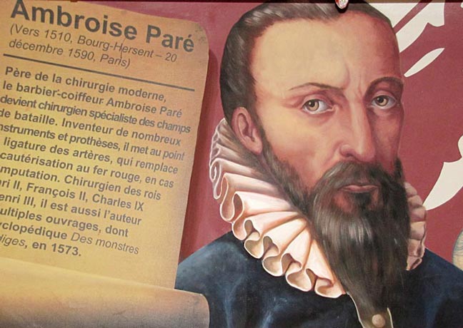 Père de la chirurgie moderne, l’autodidacte Ambroise Paré devient anatomiste puis chirurgien et se spécialise dans les champs de bataille. Inventeur de nombreux instruments et prothèses, il met au point la ligature des artères, qui remplace la cautérisation en cas d’amputation. Chirurgien des rois Henri II, François II, Charles IX et Henri III, il est aussi l’auteur de multiples ouvrages, dont l’encyclopédique Des monstres et prodiges, en 1573.
